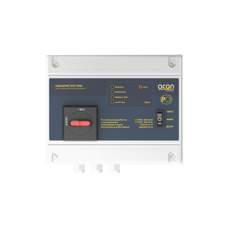 Обеспечивает защиту от перегрузки по току, от перекоса, или обрыва питающих фаз и от работы по «сухому ходу» (при отсутствии воды).