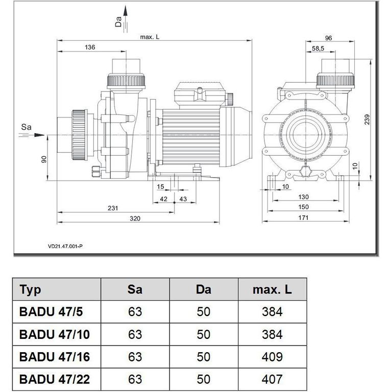 Нормальновсасывающие циркуляционные насосы BADU 47 в виде моноблока с опорожнением от остаточной воды для гидромассажа и спа ванн. 50-70 м3, 16 м³/ч, 230 В, 0,97 кВт