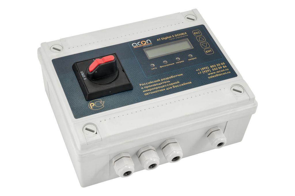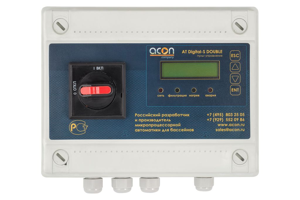 - Пульт обеспечивает управление фильтрацией по заранее задаваемым промежуткам времени суток, а также защиту насосов от работы в режиме «сухого хода», от перегрузки по току, от перекоса фаз и падения напряжения питающей сети.